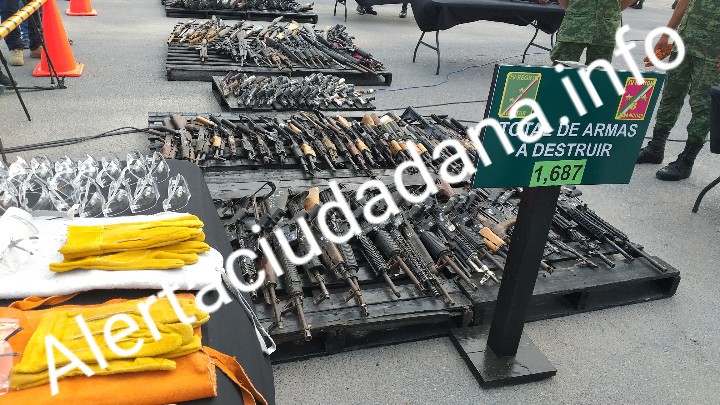 Se destruyeron mil 687 armas de fuego decomisadas en diferentes operativos realizados por la SEDENA, Policía Federal y Policía Estatal en Tamaulipas. TAM-096-2019 Mayo 23 del 2019 Reynosa, Tamaulipas.- El Gobernador, Francisco García Cabeza de Vaca, presidió junto al Comandante de la Cuarta Región Militar, General de División Jens Pedro Lohmann Iturburu y el Comandante de la Octava Zona Militar, General Carlos Arturo Pancardo Escudero, la ceremonia de destrucción de mil 687 armas decomisadas en diferentes operativos realizados en el estado de Tamaulipas, relacionadas con algún ilícito. “En Tamaulipas, los gobiernos de México y del Estado trabajamos unidos para alcanzar la paz y en este objetivo común resulta de gran relevancia acabar con las armas de fuego que en las calles amenazan la vida y tranquilidad de los tamaulipecos”, manifestó el mandatario estatal durante el evento realizado con la presencia de funcionarios de los tres órdenes de gobierno. En este sentido, el Gobernador Francisco García Cabeza de Vaca precisó que la destrucción de las casi mil 700 armas decomisadas por las instituciones federales y estatales, contribuye a restablecer la paz y el Estado de Derecho en esta entidad, así como a proteger la vida de las familias tamaulipecas. “A nombre de la sociedad y del Gobierno del Estado de Tamaulipas reconozco y agradezco la extraordinaria tarea que realiza en la entidad el Ejército Mexicano, la Marina Armada de México y la Policía Federal, extendiendo este reconocimiento y agradecimiento a los efectivos de la Policía Estatal y de la Fiscalía General de Justicia de Tamaulipas, quienes siguiendo una política permanente de colaboración institucional, suman su trabajo a la de las fuerzas de la federación”, añadió. Por su parte, el Comandante de la Octava Zona, General Carlos Arturo Pancardo Escudero dijo que la seguridad es una condición fundamental en la que se sustenta el progreso y desarrollo de los pueblos, necesidad colectiva que tiene relación directa con el ejercicio de los derechos del ciudadano en un marco pleno de libertades y legitimidad. Subrayó que con estos aseguramientos realizados por las Fuerzas Armadas y las policías federales y estatales, se logra disminuir la condición de delitos que ponen en riesgo la vida de las personas, cuyas acciones se materializan de forma permanente en esta entidad, con estricto apego a la ley, contándose para ello con el invaluable apoyo del gobierno del estado y municipios. El proceso de destrucción se llevó a cabo por personal de la Onceava Región Militar y fue atestiguado además por alumnos de educación primaria, secundaria y preparatoria de esta localidad. Al evento asistieron además la alcaldesa de Reynosa, Maki Ortíz Domínguez; la alcaldesa de Camargo, Leticia Peña Villarreal; la alcaldesa de Guerrero, Iracema Peña Ramírez; el alcalde de Miguel Alemán, Servando López Moreno; el Coordinador Estatal de Programas para el Desarrollo Social, José Ramón Leal y demás autoridades civiles y militares.