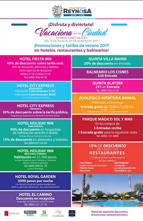 Reynosa, Tam.-Con el objetivo de que las familias reynosenses que no salen a vacacionar en este periodo, la Alcaldesa Maki Ortíz dio a conocer una serie de promociones y tarifas de verano 2017,a fin de que quienes se quedan en la ciudad aprovechen los descuentos y convivan con sus hijos.