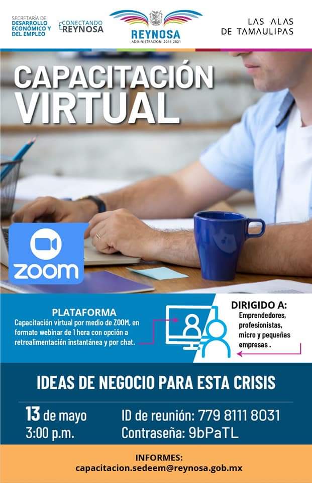 REYNOSA, TAM.- El programa de capacitación financiera, iniciado el pasado 6 de mayo por el Gobierno Municipal, que preside la Doctora Maki Esther Ortiz Domínguez, continuará el próximo martes 12 a partir de las 3 de la tarde, con el módulo Pasos para Enfrentar la Recesión Económica; el miércoles 13, Ideas de Negocio para Esta Crisis, y el jueves 14, Pasos para Reconstruir tu Negocio Después del COVID-19, con duraciónde una hora diaria cada día.