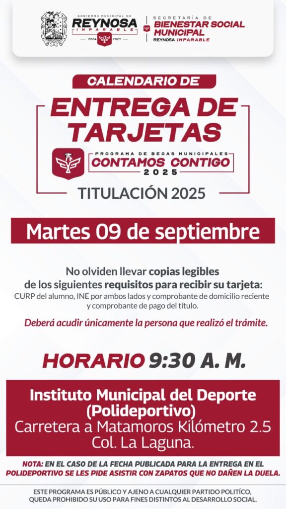 Reynosa, Tam.- El Presidente Municipal, Carlos Peña Ortiz, invita a los nuevos profesionistas a la Entrega de Tarjetas de Becas para Titulación Profesional, que se llevará a cabo este martes 9 de septiembre a partir de las 9:30 de la mañana en el Polideportivo Reynosa.