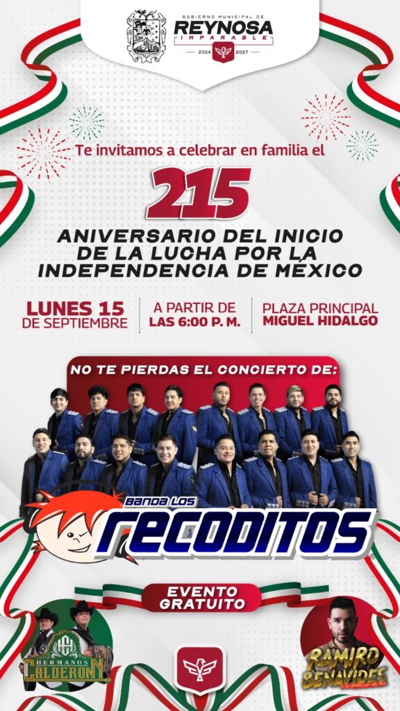 ¡El Grito es hoy! El Presidente Municipal Carlos Peña Ortiz te invita a la celebración del 215 Aniversario del Inicio de la Lucha por la Independencia de México, a partir de las 6:00 de la tarde en la plaza principal con la actuación estelar de la Banda Los Recoditos, un evento gratuito para toda la familia. Asiste, disfruta ser mexicano y canta con Los Recoditos: «Mientras Tu Jugabas», «Perfecta», «Hasta que Salga el Sol» entre otros grades éxitos de tu Banda preferida, recuerda que habrá revisión y una lista de artículos que puedes ingresar y restricción para otros, por seguridad de los asistentes.