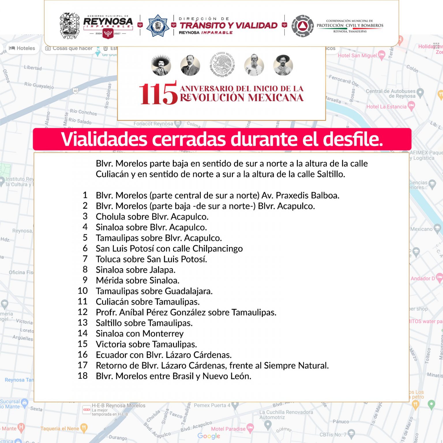 Reynosa, Tam.-El Gobierno Municipal de Reynosa te invita a conocer el cierre temporal de calles en el bulevar Morelos, por el Desfile Conmemorativo del 115 Aniversario del Inicio de la Revolución Mexicana, que se llevará a cabo este jueves 20 de noviembre.