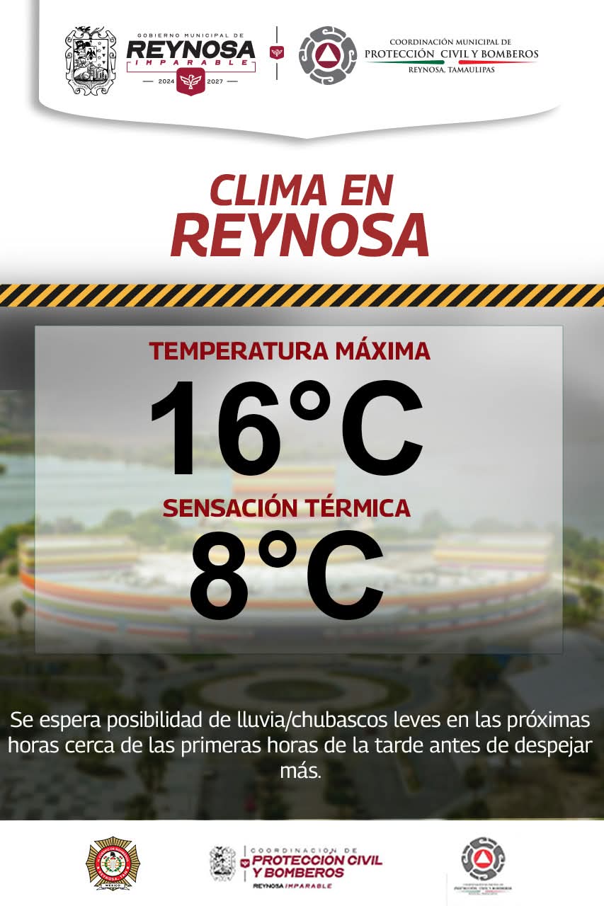 Reynosa, Tam.- El Gobierno Municipal de Reynosa recomienda a la población tomar medidas preventivas para la protección de su salud, ya que de acuerdo al pronóstico del Servicio Meteorológico Nacional, la temperatura que podría ir abajo de 16° Centígrados, con muy alta probabilidad de lluvia para este día domingo.