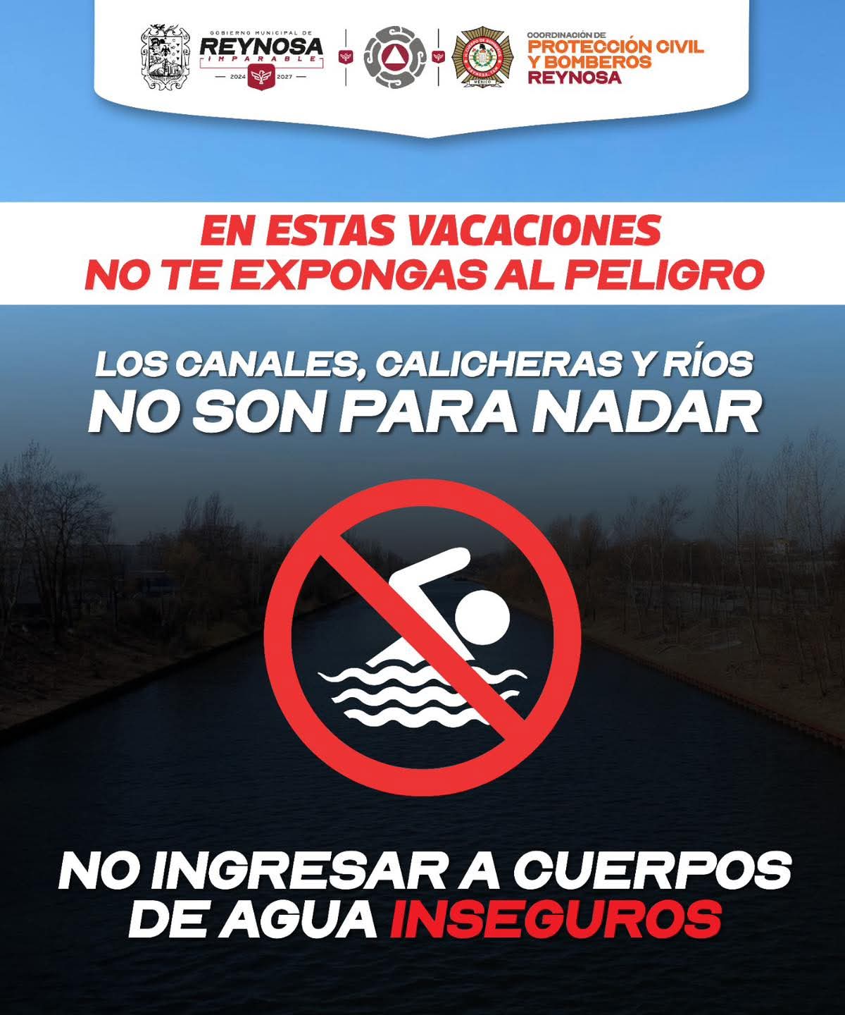 Reynosa, Tam.- El Gobierno Municipal de Reynosa hace un importante recordatorio a la comunidad, a evitar introducirse en canales, drenes, ríos y calicheras; especialmente en el río Bravo, pues no son aptos para su esparcimiento por cuestión de seguridad e higiene.